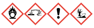 - Oxidující: Reaguje prudce s organickými a hořlavými látkami